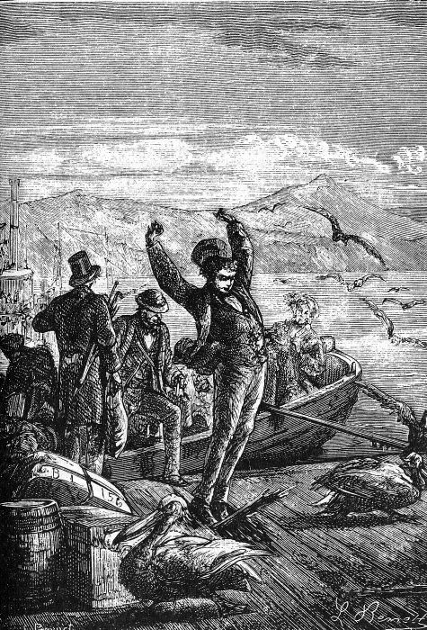 Passepartout, dans sa joie de toucher enfin la terre américaine, avait cru devoir opérer son débarquement en exécutant un saut périlleux du plus beau style. Mais quand il retomba sur le quai dont le plancher était vermoulu, il faillit passer au travers. Tout décontenancé de la façon dont il avait « pris pied » sur le nouveau continent, l’honnête garçon poussa un cri formidable, qui fit envoler une innombrable troupe de cormorans et de pélicans, hôtes habituels des quais mobiles.