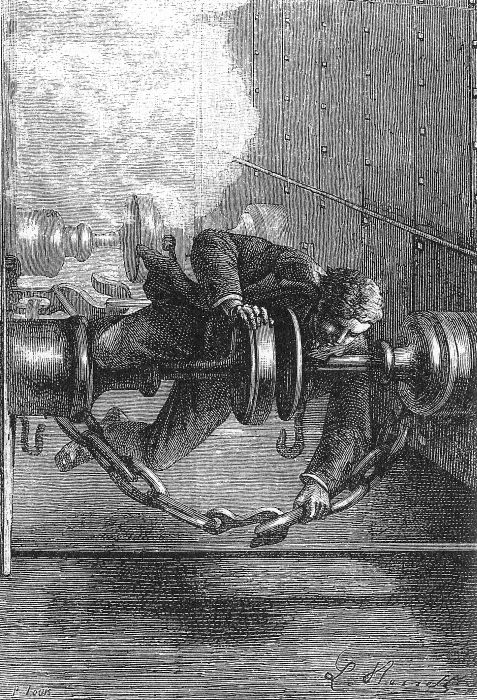 Phileas Fogg n’eut pas le temps d’arrêter ce courageux garçon, qui, ouvrant une portière sans être vu des Indiens, parvint à se glisser sous le wagon. Et alors, tandis que la lutte continuait, pendant que les balles se croisaient au-dessus de sa tête, retrouvant son agilité, sa souplesse de clown, se faufilant sous les wagons, s’accrochant aux chaînes, s’aidant du levier des freins et des longerons des châssis, rampant d’une voiture à l’autre avec une adresse merveilleuse, il gagna ainsi l’avant du train. Il n’avait pas été vu, il n’avait pu l’être.