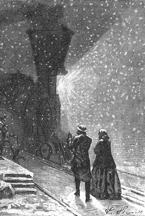 En effet, vers deux heures après midi, pendant que la neige tombait à gros flocons, on entendit de longs sifflets qui venaient de l’est. Une énorme ombre, précédée d’une lueur fauve, s’avançait lentement, considérablement grandie par les brumes, qui lui donnaient un aspect fantastique.