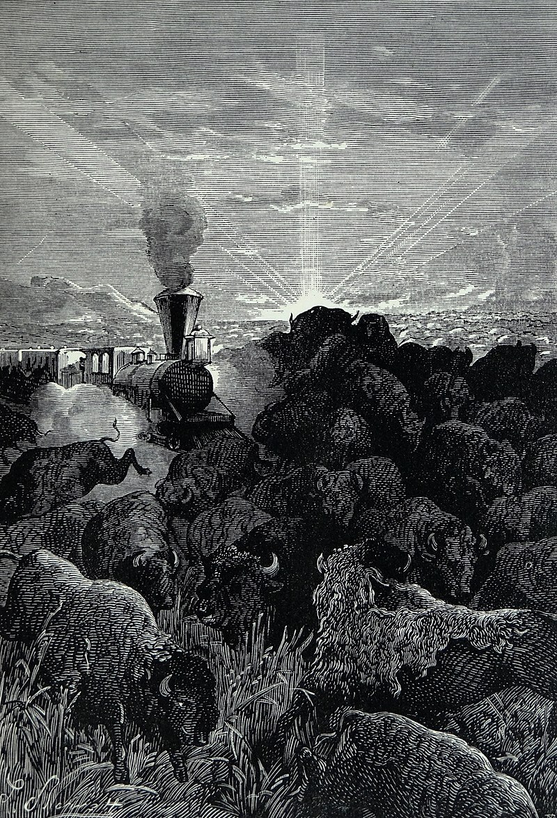 Cependant tous les voyageurs avaient quitté le train. Les roues des wagons étaient tachées de sang. Aux moyeux et aux rayons pendaient d’informes lambeaux de chair. On voyait à perte de vue sur la plaine blanche de longues traînées rouges. Les derniers Indiens disparaissaient alors dans le sud, du côté de Republican-river.
