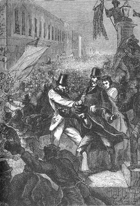 Mrs. Aouda, au bras de Phileas Fogg, regardait avec surprise cette scène tumultueuse, et Fix allait demander à l’un de ses voisins la raison de cette effervescence populaire, quand un mouvement plus accusé se prononça. Les hurrahs, agrémentés d’injures, redoublèrent. La hampe des bannières se transforma en arme offensive. Plus de mains, des poings partout. Du haut des voitures arrêtées, et des omnibus enrayés dans leur course, s’échangeaient force horions. Tout servait de projectiles. Bottes et souliers décrivaient dans l’air des trajectoires très-tendues, et il sembla même que quelques revolvers mêlaient aux vociférations de la foule leurs détonations nationales.